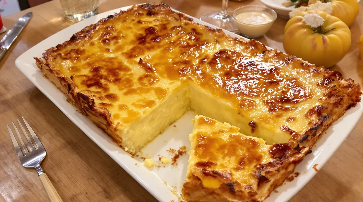 Visuellement, il ressemble à un flan épais. On le coupe en gros carrés, on le partage à même le plat, parfois encore chaud. Les bords sont bien dorés, presque caramélisés. Le centre, lui, reste moelleux et fondant. C’est un vrai gâteau de grand-mère : modeste, mais impossible à oublier.